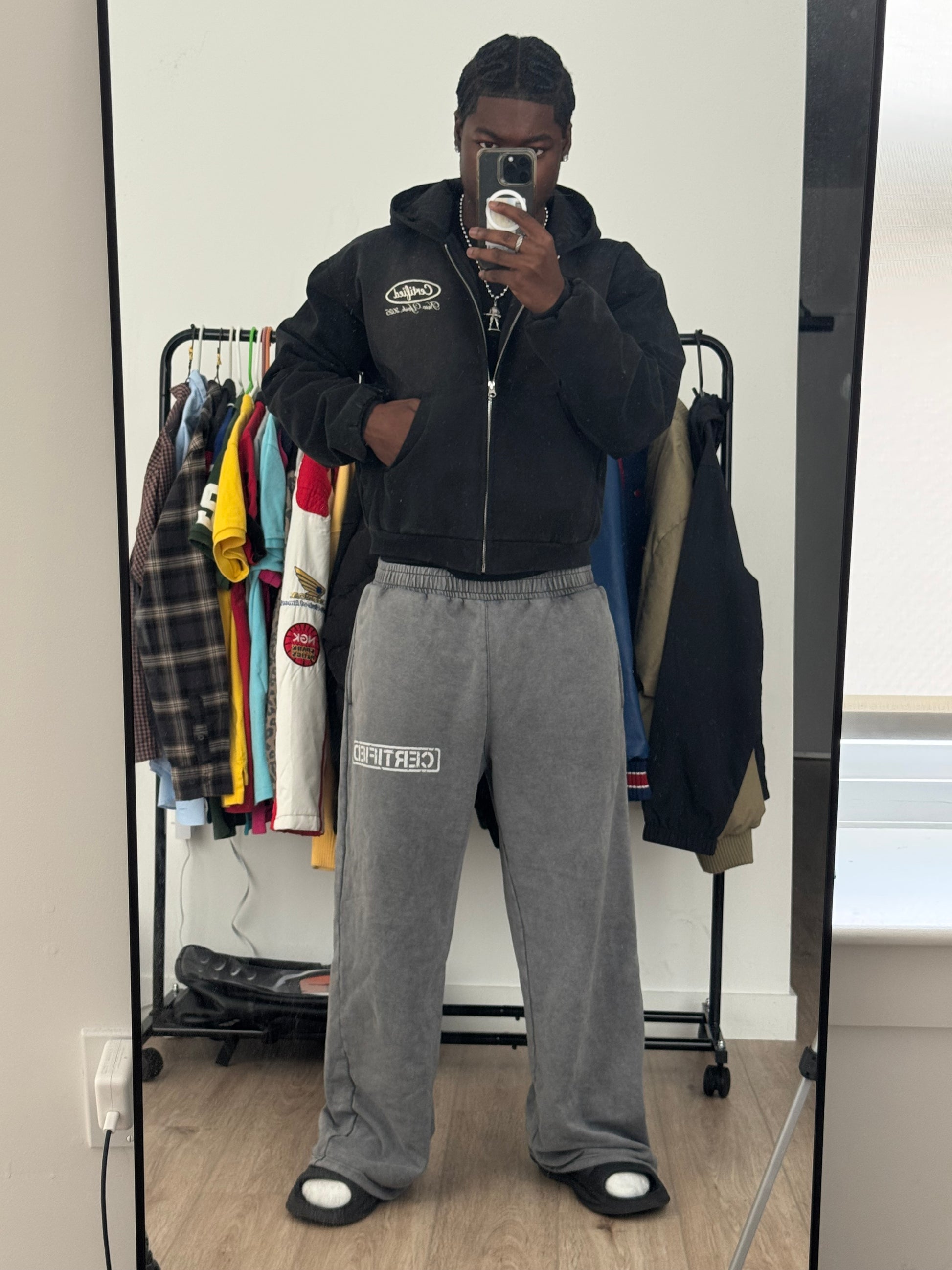 Fits wide leg with a baggy fit. Drawstrings inside for waist adjustment.